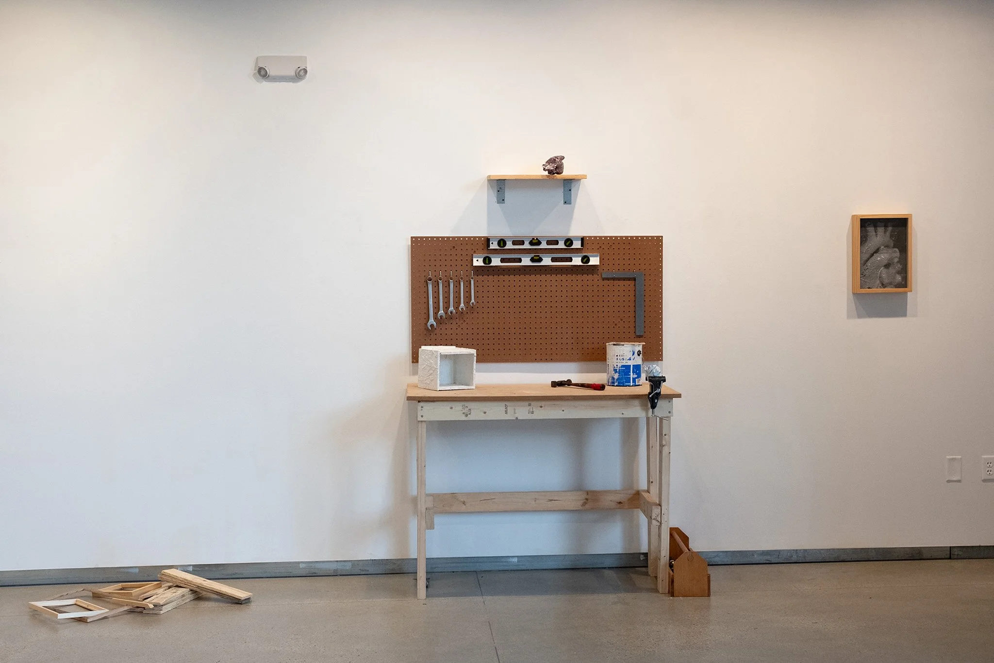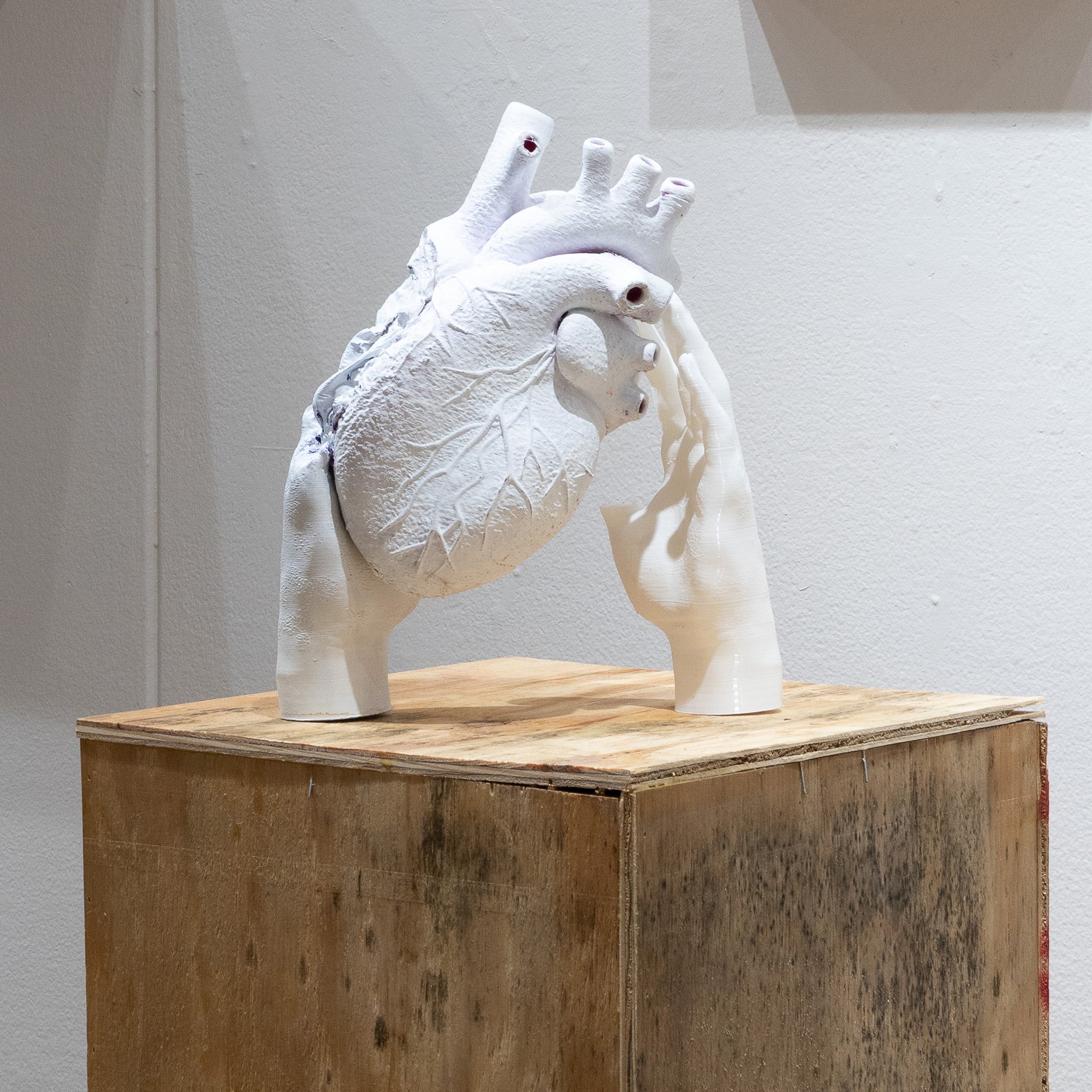 Inspired by my roots in rural, south Georgia, this installation defies demeaning tropes of the blue-collar southern individual. Marrying the sacred to the simple, In Flux places Greco-Roman stylized human hands and hearts in the physical space of a utilitarian style workshop. Vulnerable human anatomy in a rugged, often hazardous environment elicits care for these objects and by extension the individuals who they represent.